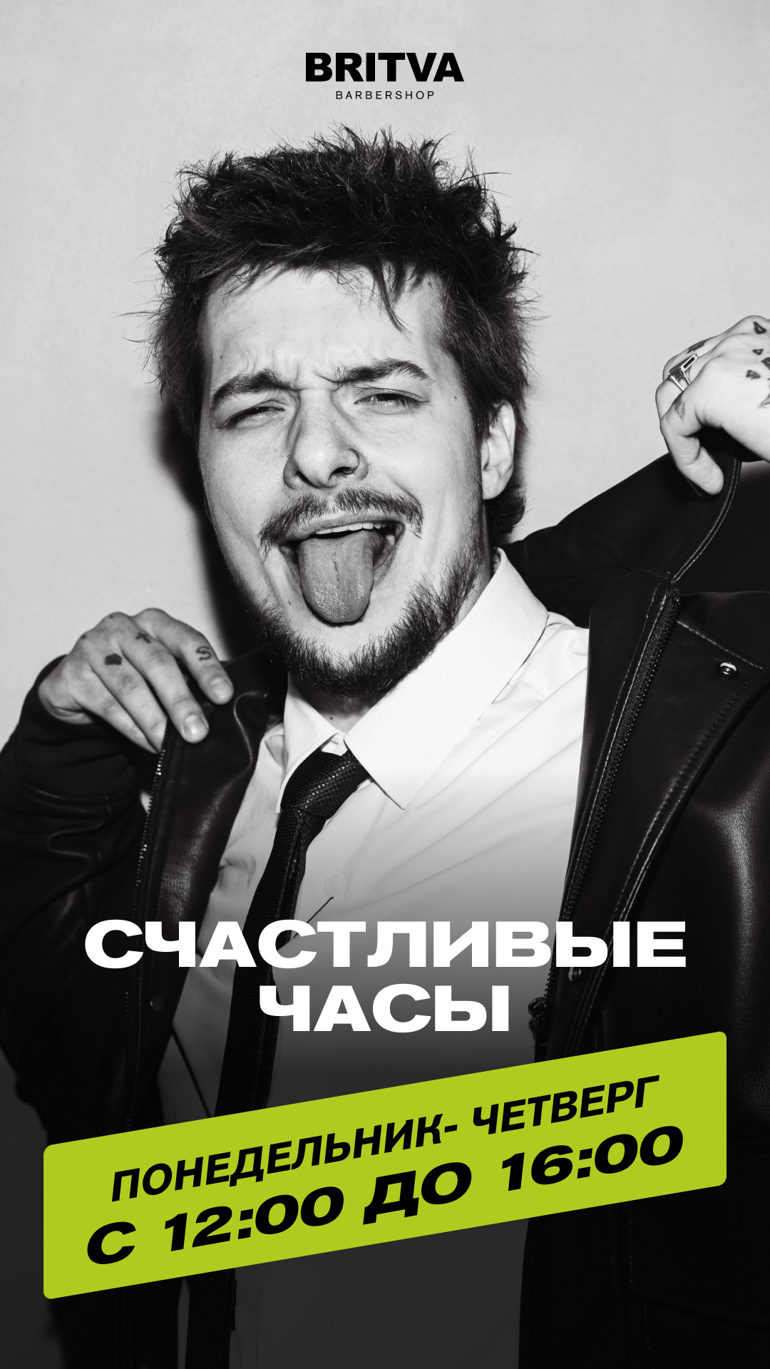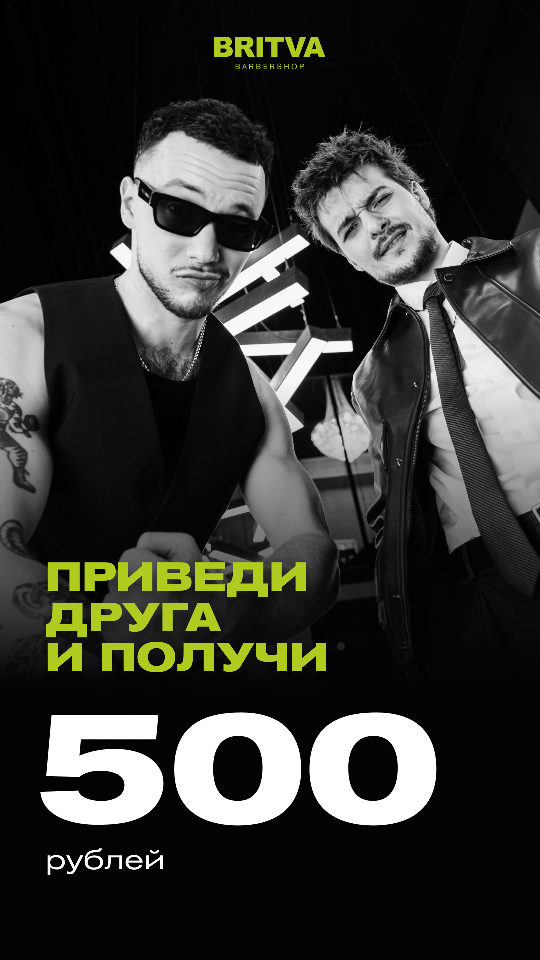 • когда твой друг воспользуется услугами в BRITVA, тогда каждому из вас будет начислена скидка 500 рублей, которой вы сможете воспользоваться при следующем посещении барбершопа (при покупке услуги от 1000 рублей);